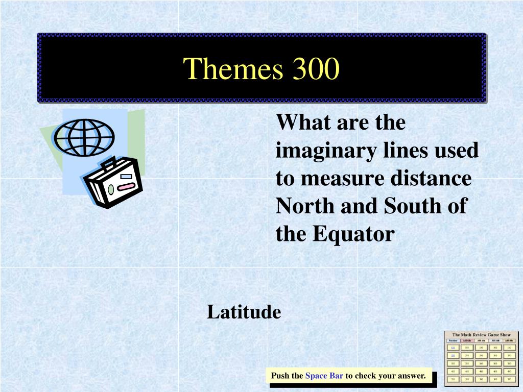 Themes 300 What are the imaginary lines used to measure distance North and South of the Equator Latitude Push the Space Bar to check your answer.
