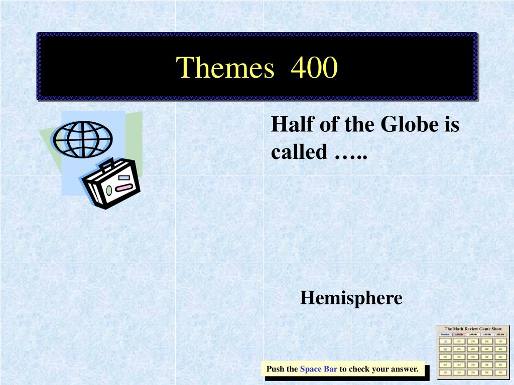 Themes 400 Half of the Globe is called ….. Hemisphere Push the Space Bar to check your answer.