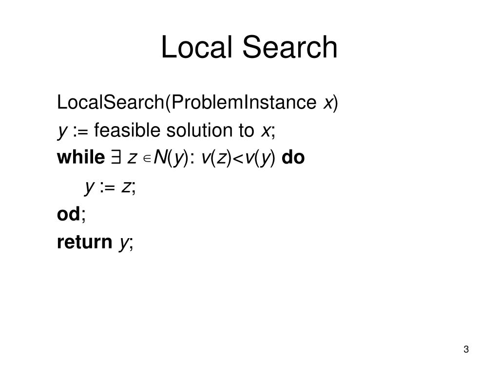 Local Search LocalSearch(ProblemInstance x) y := feasible solution to x; while 9z∊N(y): v(z)<v(y)do y := z; od; returny;