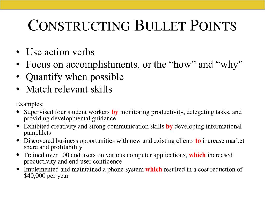 Bullet Points: Good to Great • Good: “Organized rush activities for fraternity.” • Great: “Developed new rush strategies; doubled number of prospective members.” • Good: “Helped students with their homework.” • Great: “Tutored five students in biology which increased test scores an average of 10 points.”