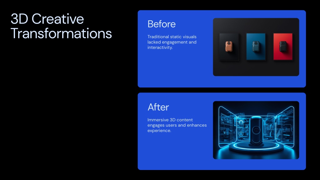 6. 3D Creative Transformations Before Traditional static visuals lacked engagement and interactivity. After Immersive 3D content engages users and enhances experience.