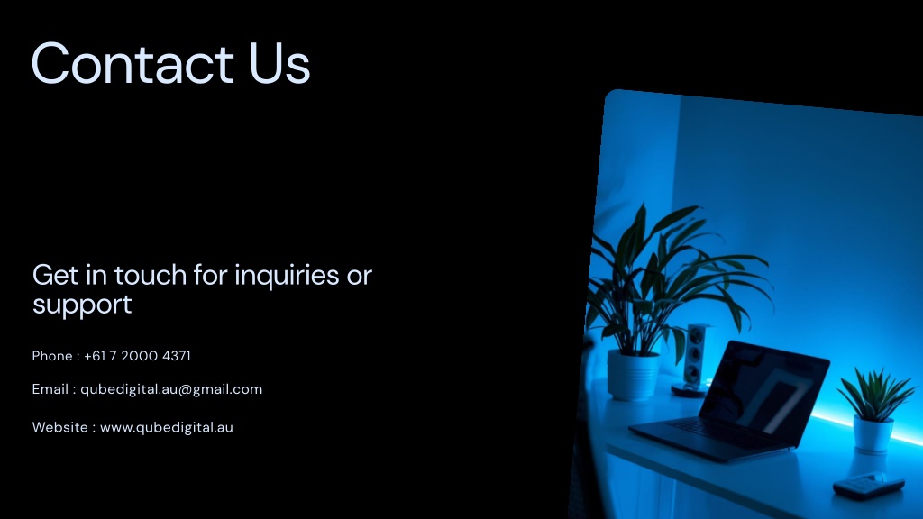 10. Contact Us Get in touch for inquiries or support Phone : +61 7 2000 4371 Email : qubedigital.au@gmail.com Website : www.qubedigital.au