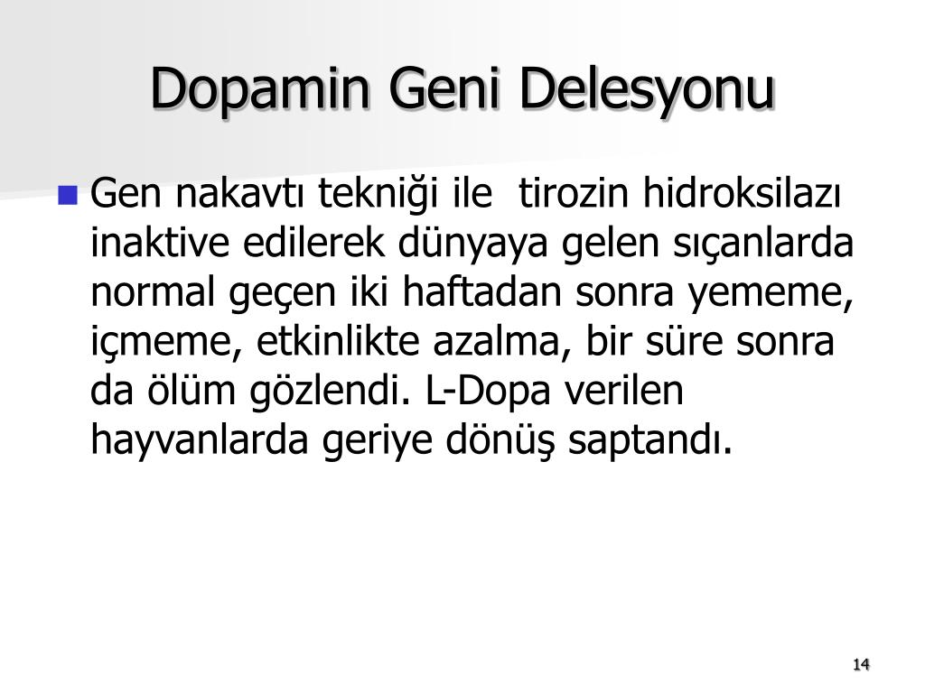 Dopamin Geni Delesyonu • Gen nakavtı tekniği ile tirozin hidroksilazı inaktive edilerek dünyaya gelen sıçanlarda normal geçen iki haftadan sonra yememe, içmeme, etkinlikte azalma, bir süre sonra da ölüm gözlendi. L-Dopa verilen hayvanlarda geriye dönüş saptandı.
