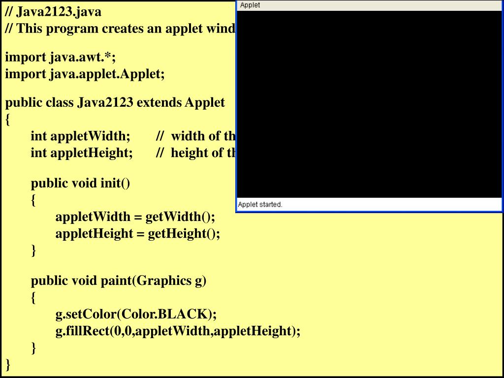 // Java2123.java // This program creates an applet window with a black background. import java.awt.*; import java.applet.Applet; public class Java2123 extends Applet { intappletWidth; // width of the Applet window intappletHeight; // height of the Applet window public void init() { appletWidth = getWidth(); appletHeight = getHeight(); } public void paint(Graphics g) { g.setColor(Color.BLACK); g.fillRect(0,0,appletWidth,appletHeight); } }