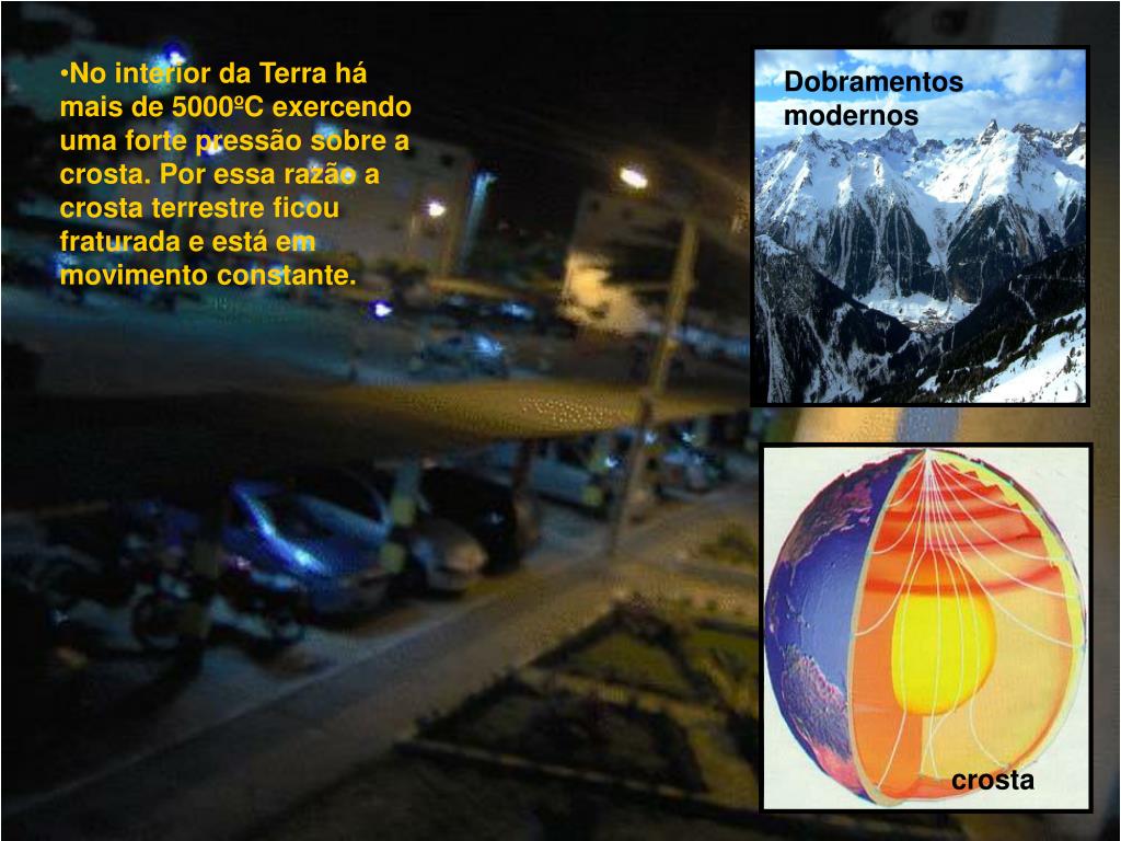 No interior da Terra há mais de 5000ºC exercendo uma forte pressão sobre a crosta. Por essa razão a crosta terrestre ficou fraturada e está em movimento constante. Dobramentos modernos • No interior da Terra há mais de 5000ºC exercendo uma forte pressão sobre a crosta. Por essa razão a crosta terrestre ficou fraturada e está em movimento constante. crosta