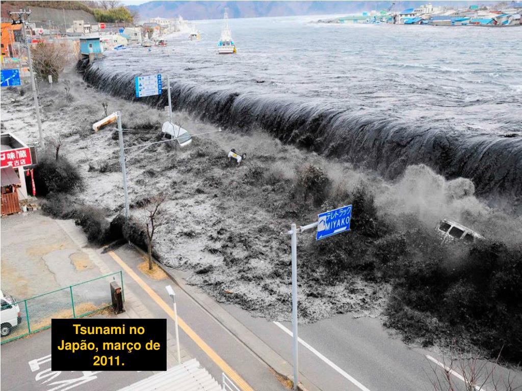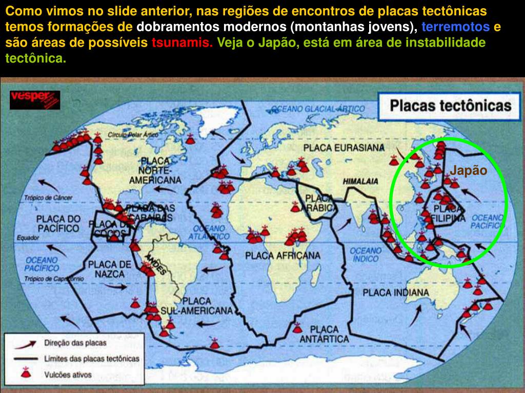 Como vimos no slide anterior, nas regiões de encontros de placas tectônicas temos formações de dobramentos modernos (montanhas jovens),terremotos e são áreas de possíveis tsunamis. Veja o Japão, está em área de instabilidade tectônica. Japão