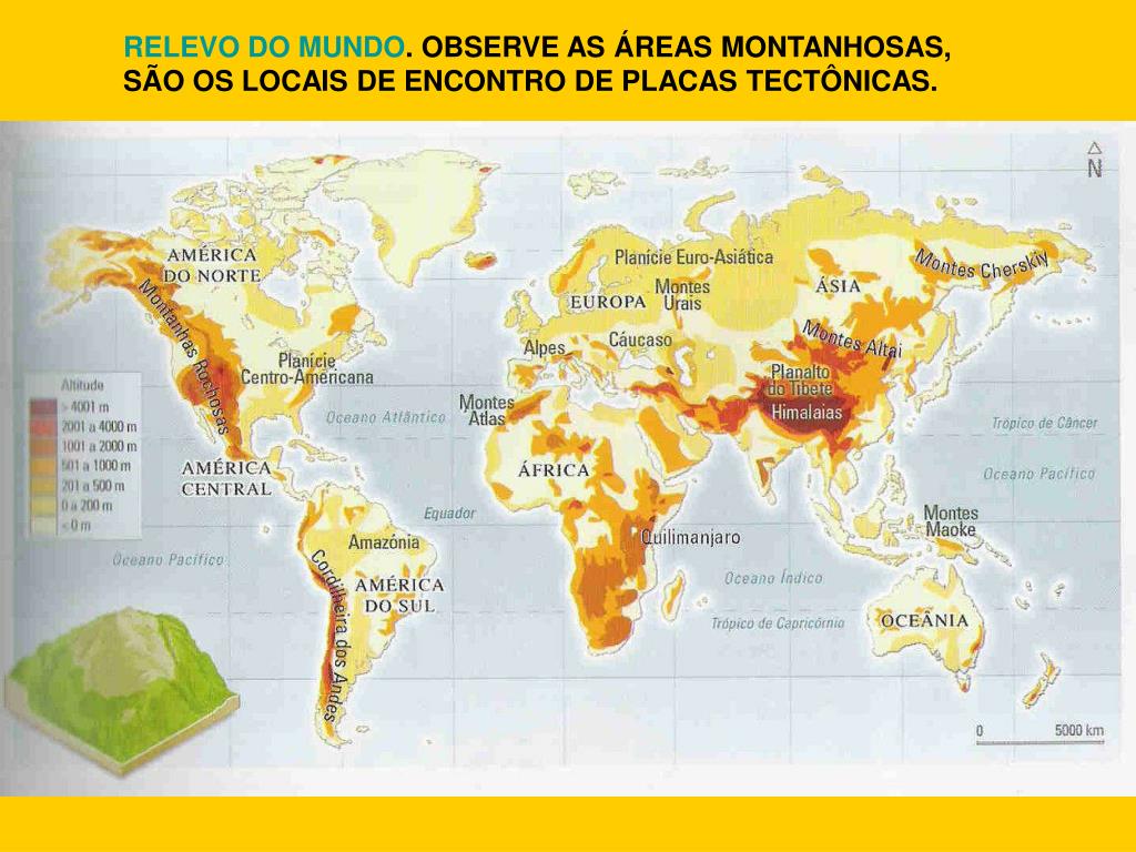 RELEVO DO MUNDO. OBSERVE AS ÁREAS MONTANHOSAS, SÃO OS LOCAIS DE ENCONTRO DE PLACAS TECTÔNICAS.