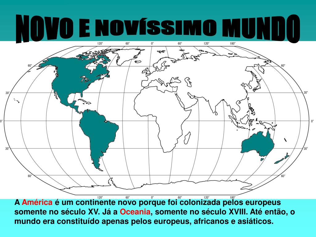 NOVO E NOVÍSSIMO MUNDO A América é um continente novo porque foi colonizada pelos europeus somente no século XV. Já a Oceania, somente no século XVIII. Até então, o mundo era constituído apenas pelos europeus, africanos e asiáticos.