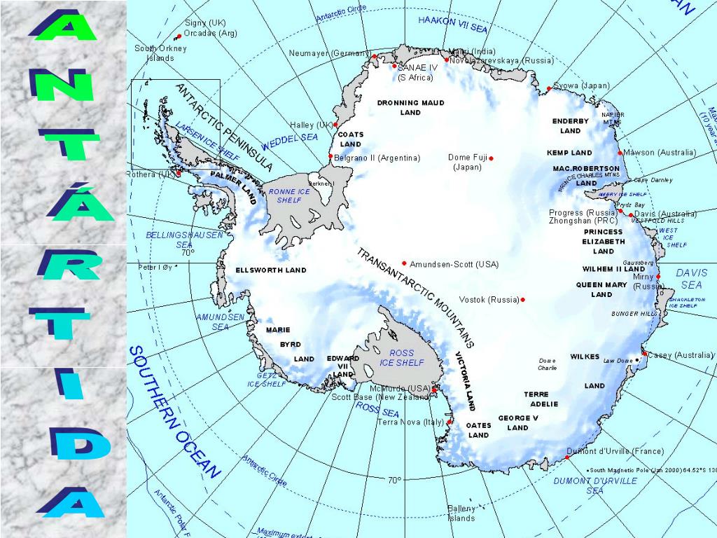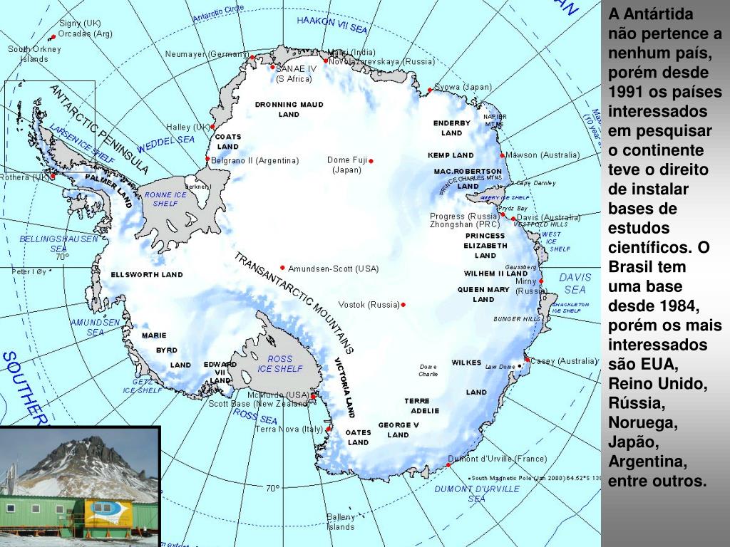 A Antártida não pertence a nenhum país, porém desde 1991 os países interessados em pesquisar o continente teve o direito de instalar bases de estudos científicos. O Brasil tem uma base desde 1984, porém os mais interessados são EUA, Reino Unido, Rússia, Noruega, Japão, Argentina, entre outros.
