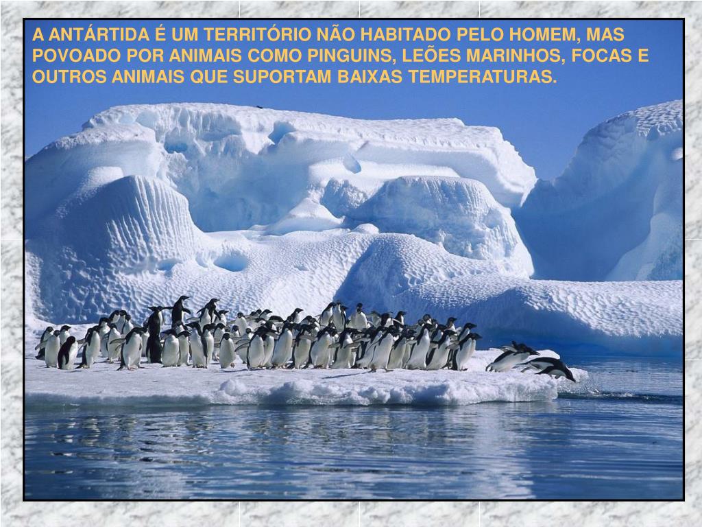 A ANTÁRTIDA É UM TERRITÓRIO NÃO HABITADO PELO HOMEM, MAS POVOADO POR ANIMAIS COMO PINGUINS, LEÕES MARINHOS, FOCAS E OUTROS ANIMAIS QUE SUPORTAM BAIXAS TEMPERATURAS.