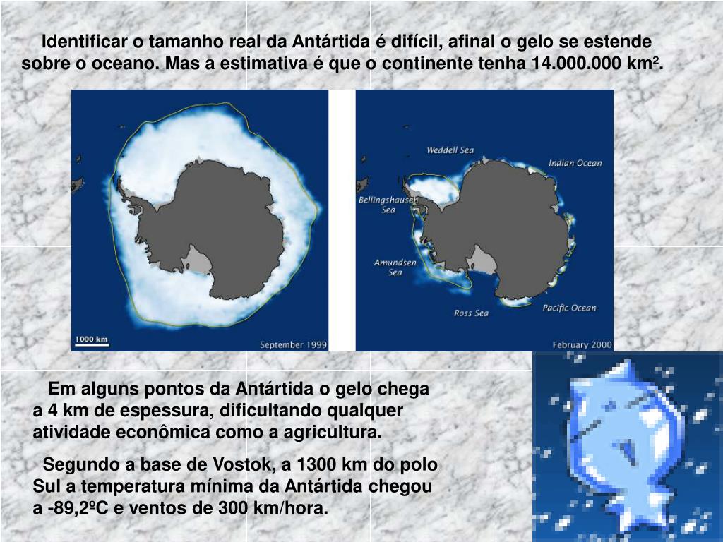 Identificar o tamanho real da Antártida é difícil, afinal o gelo se estende sobre o oceano. Mas a estimativa é que o continente tenha 14.000.000 km². Em alguns pontos da Antártida o gelo chega a 4 km de espessura, dificultando qualquer atividade econômica como a agricultura. Segundo a base de Vostok, a 1300 km do polo Sul a temperatura mínima da Antártida chegou a -89,2ºC e ventos de 300 km/hora.