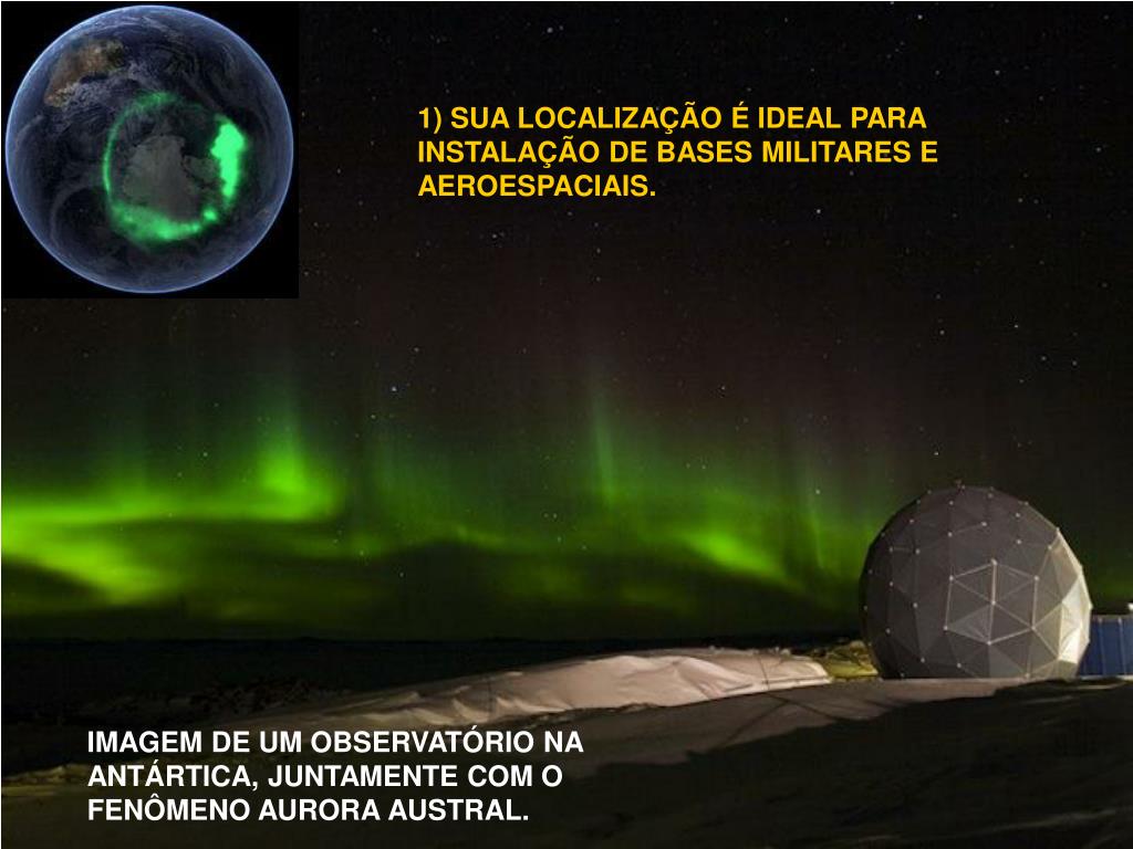 1) SUA LOCALIZAÇÃO É IDEAL PARA INSTALAÇÃO DE BASES MILITARES E AEROESPACIAIS. IMAGEM DE UM OBSERVATÓRIO NA ANTÁRTICA, JUNTAMENTE COM O FENÔMENO AURORA AUSTRAL.