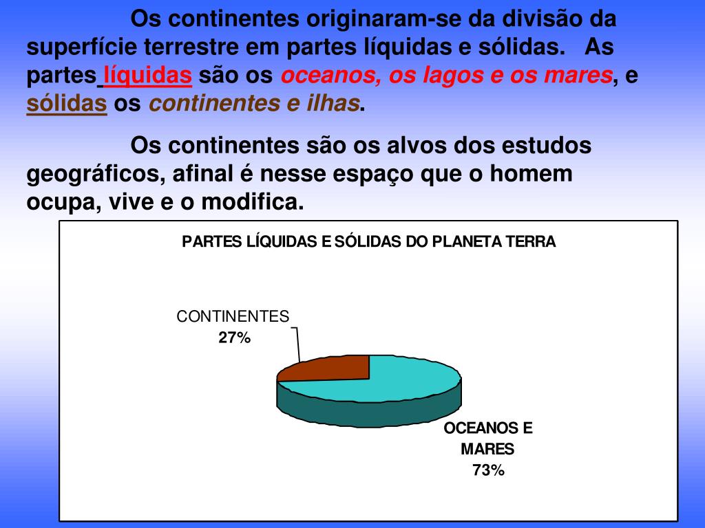 Os continentes originaram-se da divisão da superfície terrestre em partes líquidas e sólidas. As parteslíquidas são os oceanos, os lagos e os mares, e sólidas os continentes e ilhas. Os continentes são os alvos dos estudos geográficos, afinal é nesse espaço que o homem ocupa, vive e o modifica.