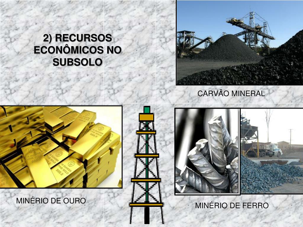 2) RECURSOS ECONÔMICOS NO SUBSOLO CARVÃO MINERAL MINÉRIO DE OURO MINÉRIO DE FERRO