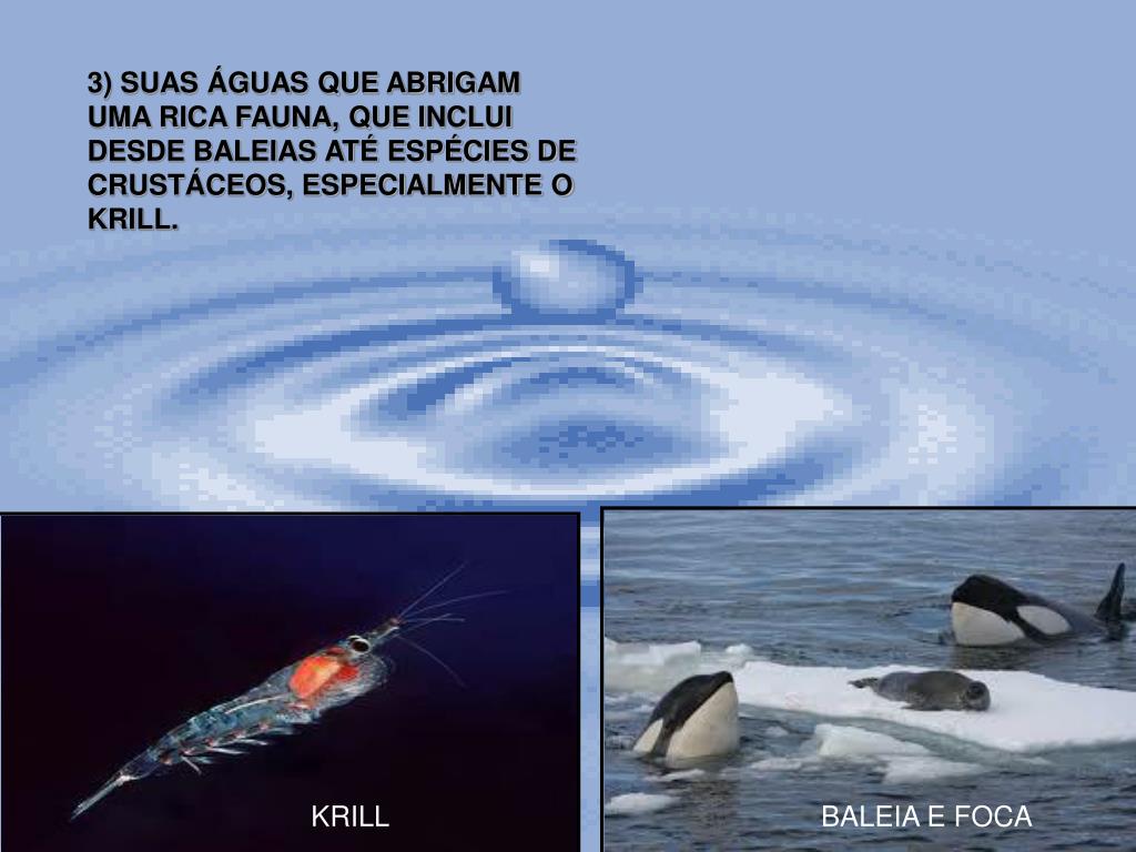 3) SUAS ÁGUAS QUE ABRIGAM UMA RICA FAUNA, QUE INCLUI DESDE BALEIAS ATÉ ESPÉCIES DE CRUSTÁCEOS, ESPECIALMENTE O KRILL. KRILL BALEIA E FOCA
