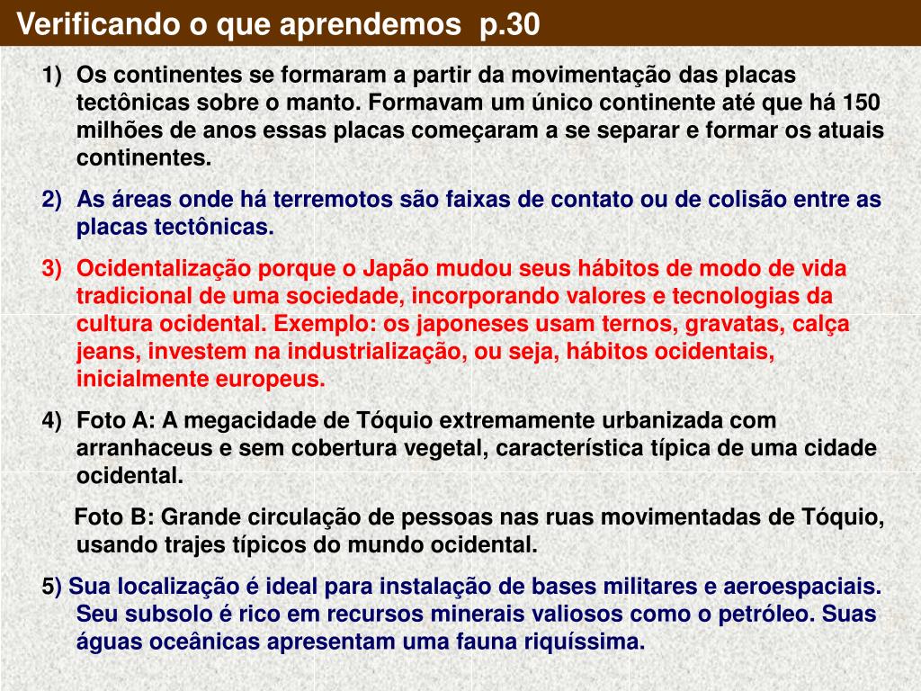 Verificando o que aprendemos p.30 • Os continentes se formaram a partir da movimentação das placas tectônicas sobre o manto. Formavam um único continente até que há 150 milhões de anos essas placas começaram a se separar e formar os atuais continentes. • As áreas onde há terremotos são faixas de contato ou de colisão entre as placas tectônicas. • Ocidentalização porque o Japão mudou seus hábitos de modo de vida tradicional de uma sociedade, incorporando valores e tecnologias da cultura ocidental. Exemplo: os japoneses usam ternos, gravatas, calça jeans, investem na industrialização, ou seja, hábitos ocidentais, inicialmente europeus. • Foto A: A megacidade de Tóquio extremamente urbanizada com arranhaceus e sem cobertura vegetal, característica típica de uma cidade ocidental. • Foto B: Grande circulação de pessoas nas ruas movimentadas de Tóquio, usando trajes típicos do mundo ocidental. • 5) Sua localização é ideal para instalação de bases militares e aeroespaciais. Seu subsolo é rico em recursos minerais valiosos como o petróleo. Suas águas oceânicas apresentam uma fauna riquíssima.