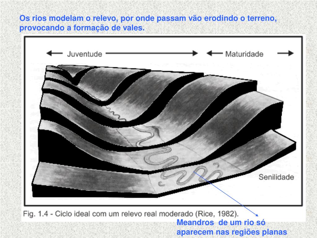 Os rios modelam o relevo, por onde passam vão erodindo o terreno, provocando a formação de vales. Meandros de um rio só aparecem nas regiões planas