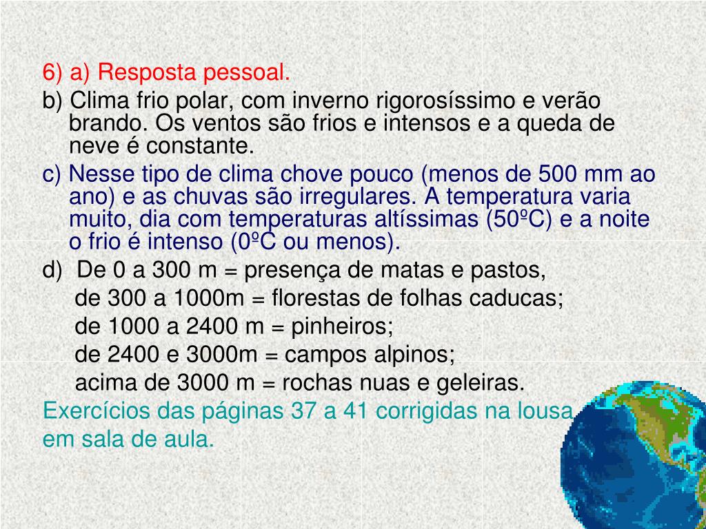 6) a) Resposta pessoal. b) Clima frio polar, com inverno rigorosíssimo e verão brando. Os ventos são frios e intensos e a queda de neve é constante. c) Nesse tipo de clima chove pouco (menos de 500 mm ao ano) e as chuvas são irregulares. A temperatura varia muito, dia com temperaturas altíssimas (50ºC) e a noite o frio é intenso (0ºC ou menos). d) De 0 a 300 m = presença de matas e pastos, de 300 a 1000m = florestas de folhas caducas; de 1000 a 2400 m = pinheiros; de 2400 e 3000m = campos alpinos; acima de 3000 m = rochas nuas e geleiras. Exercícios das páginas 37 a 41 corrigidas na lousa em sala de aula.