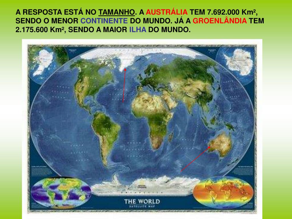 A RESPOSTA ESTÁ NO TAMANHO. A AUSTRÁLIA TEM 7.692.000 Km², SENDO O MENOR CONTINENTE DO MUNDO. JÁ A GROENLÂNDIA TEM 2.175.600 Km², SENDO A MAIOR ILHA DO MUNDO.