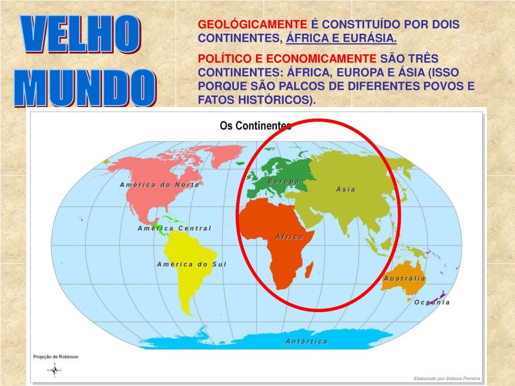 VELHO MUNDO GEOLÓGICAMENTE É CONSTITUÍDO POR DOIS CONTINENTES, ÁFRICA E EURÁSIA. POLÍTICO E ECONOMICAMENTE SÃO TRÊS CONTINENTES: ÁFRICA, EUROPA E ÁSIA (ISSO PORQUE SÃO PALCOS DE DIFERENTES POVOS E FATOS HISTÓRICOS).