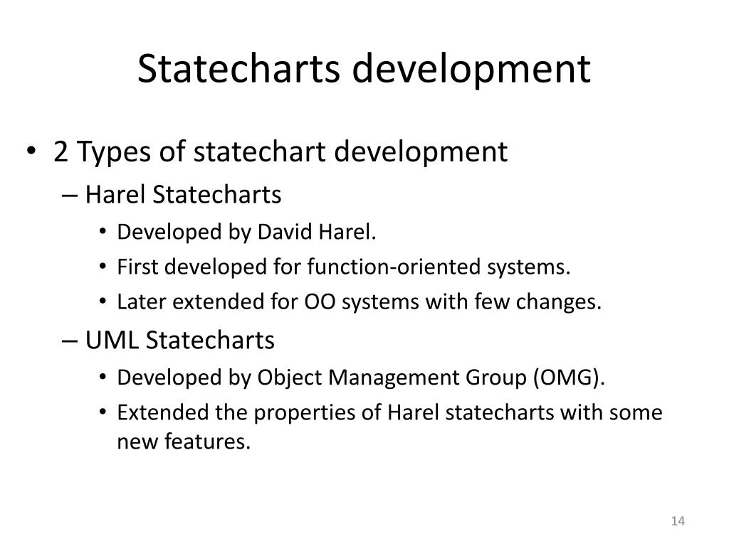 Statecharts development • 2 Types of statechart development • HarelStatecharts • Developed by David Harel. • First developed for function-oriented systems. • Later extended for OO systems with few changes. • UML Statecharts • Developed by Object Management Group (OMG). • Extended the properties of Harelstatecharts with some new features.