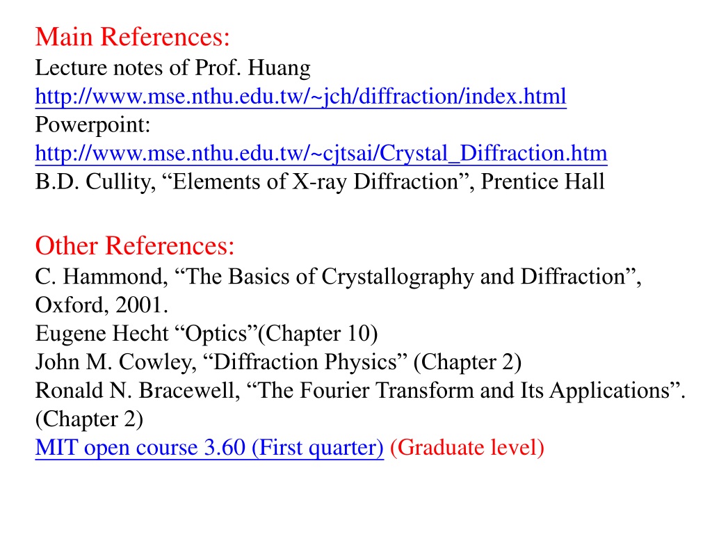 Main References: • Lecture notes of Prof. Huang • http://www.mse.nthu.edu.tw/~jch/diffraction/index.html • Powerpoint: http://www.mse.nthu.edu.tw/~cjtsai/Crystal_Diffraction.htm • B.D. Cullity, “Elements of X-ray Diffraction”, Prentice Hall • Other References: • C. Hammond, “The Basics of Crystallography and Diffraction”, Oxford, 2001. • Eugene Hecht “Optics”(Chapter 10) • John M. Cowley, “Diffraction Physics” (Chapter 2) • Ronald N. Bracewell, “The Fourier Transform and Its Applications”. (Chapter 2) • MIT open course 3.60 (First quarter)(Graduate level)