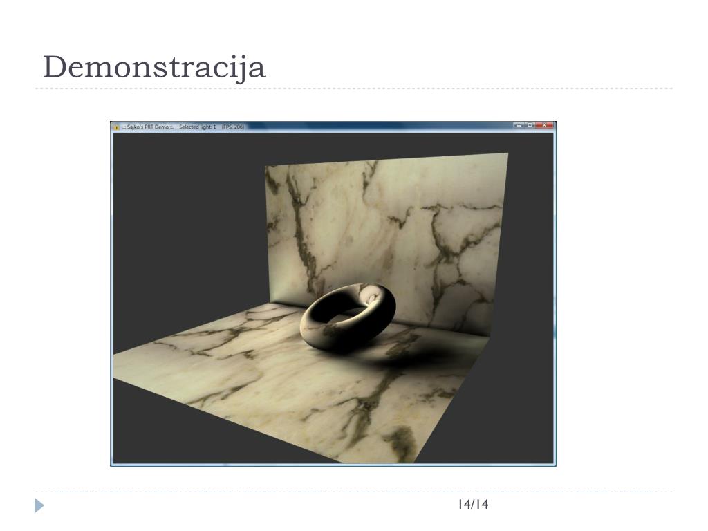 Sadržaj • Fizikalni model svjetla • Jednadžba iscrtavanja • Lokalni modeli osvjetljenja • Globalni modeli osvjetljenja • PRT • Pregled • Demonstracija 1/14
