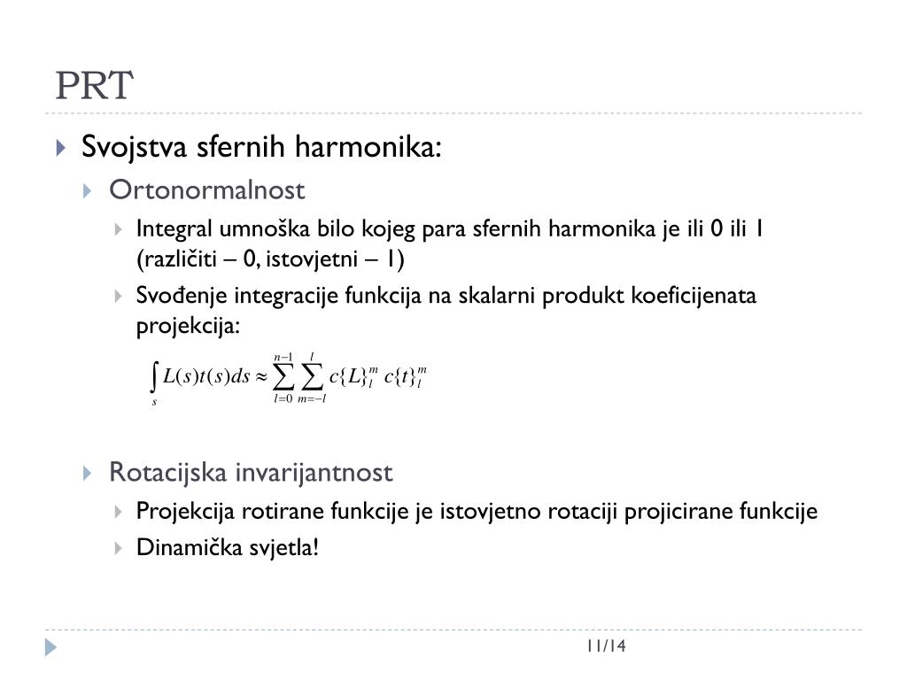 PRT • Svojstva sfernih harmonika: • Ortonormalnost • Integral umnoška bilo kojeg para sfernih harmonika je ili 0 ili 1(različiti – 0, istovjetni – 1) • Svođenje integracije funkcija na skalarni produkt koeficijenata projekcija: • Rotacijska invarijantnost • Projekcija rotirane funkcije je istovjetno rotaciji projicirane funkcije • Dinamička svjetla! 11/14