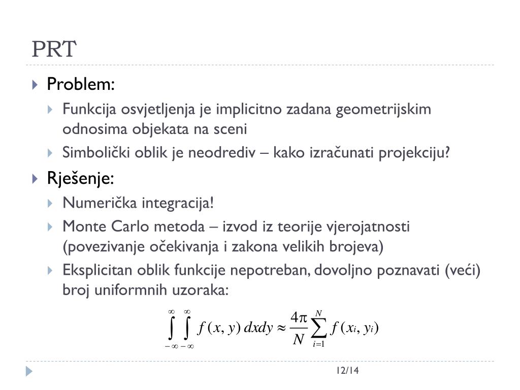 PRT • Problem: • Funkcija osvjetljenja je implicitno zadana geometrijskim odnosima objekata na sceni • Simbolički oblik je neodrediv – kako izračunati projekciju? • Rješenje: • Numerička integracija! • Monte Carlo metoda – izvod iz teorije vjerojatnosti (povezivanje očekivanja i zakona velikih brojeva) • Eksplicitan oblik funkcije nepotreban, dovoljno poznavati (veći) broj uniformnih uzoraka: 12/14