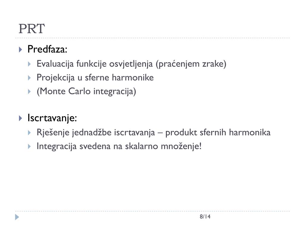PRT • Predfaza: • Evaluacija funkcije osvjetljenja (praćenjem zrake) • Projekcija u sferne harmonike • (Monte Carlo integracija) • Iscrtavanje: • Rješenje jednadžbe iscrtavanja – produkt sfernih harmonika • Integracija svedena na skalarno množenje! 8/14
