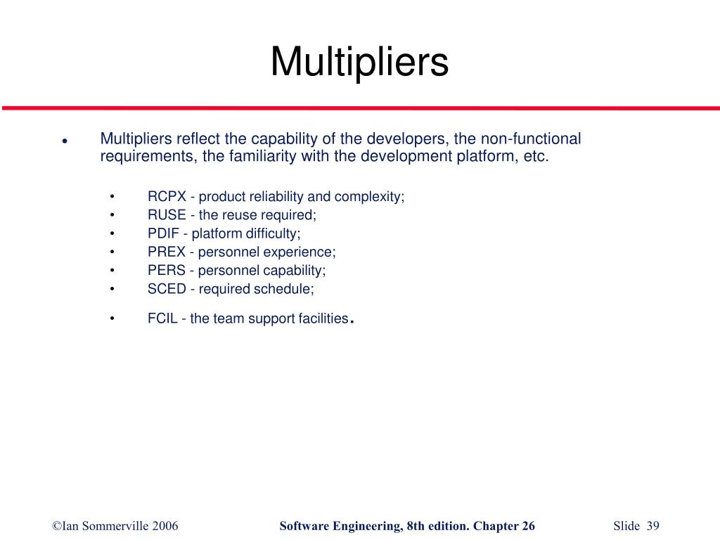 Multipliers • Multipliers reflect the capability of the developers, the non-functional requirements, the familiarity with the development platform, etc. • RCPX - product reliability and complexity; • RUSE - the reuse required; • PDIF - platform difficulty; • PREX - personnel experience; • PERS - personnel capability; • SCED - required schedule; • FCIL - the team support facilities.