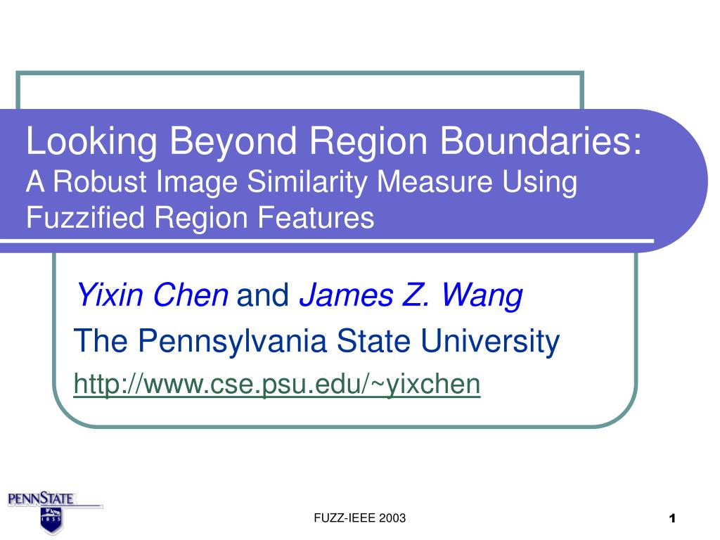 Looking Beyond Region Boundaries:A Robust Image Similarity Measure Using Fuzzified Region Features Yixin Chen and James Z. Wang The Pennsylvania State University http://www.cse.psu.edu/~yixchen FUZZ-IEEE 2003