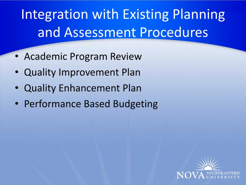 Integration with Existing Planning and Assessment Procedures • Academic Program Review • Quality Improvement Plan • Quality Enhancement Plan • Performance Based Budgeting