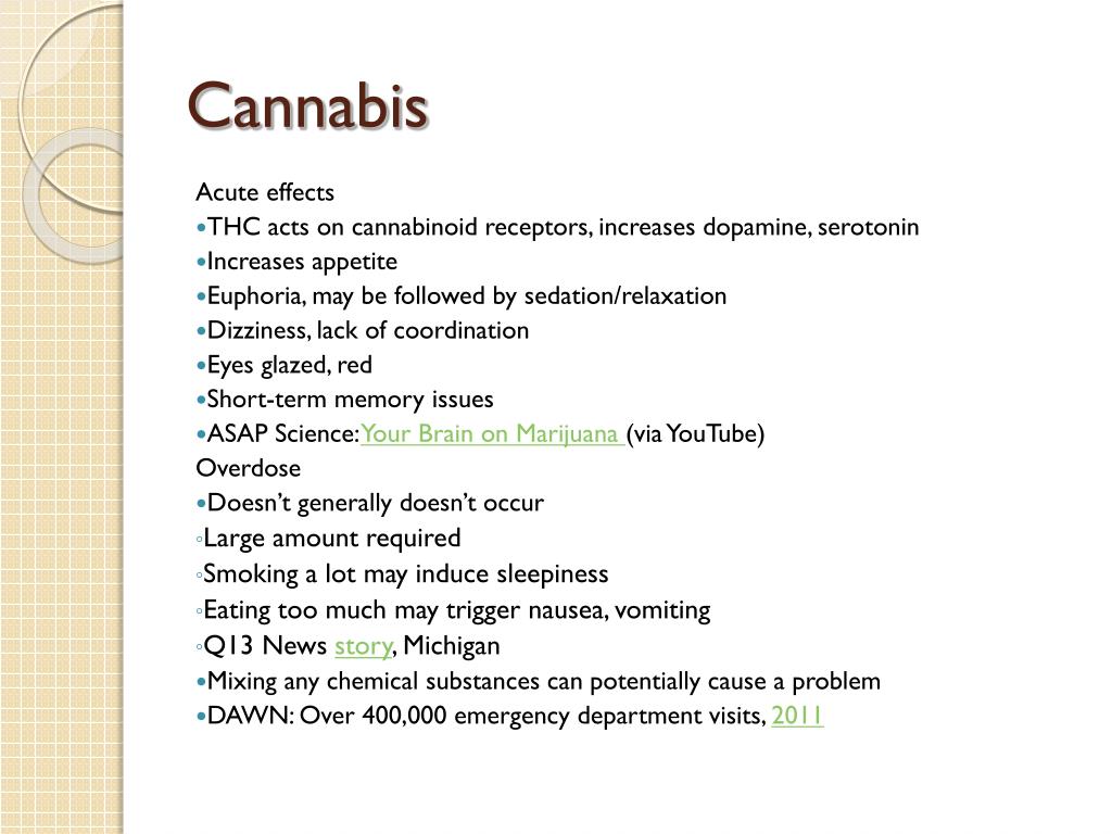 Cannabis Acute effects • THC acts on cannabinoid receptors, increases dopamine, serotonin • Increases appetite • Euphoria, may be followed by sedation/relaxation • Dizziness, lack of coordination • Eyes glazed, red • Short-term memory issues • ASAP Science: Your Brain on Marijuana (via YouTube) Overdose • Doesn’t generally doesn’t occur • Large amount required • Smoking a lot may induce sleepiness • Eating too much may trigger nausea, vomiting • Q13 News story, Michigan • Mixing any chemical substances can potentially cause a problem • DAWN: Over 400,000 emergency department visits, 2011
