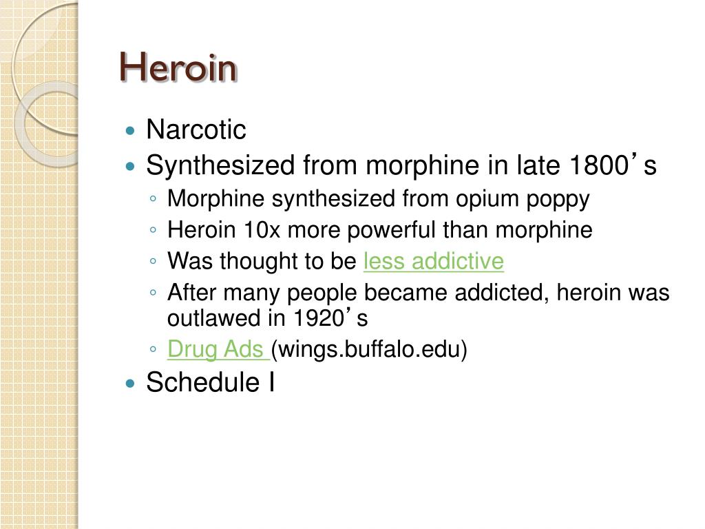 Heroin • Narcotic • Synthesized from morphine in late 1800’s • Morphine synthesized from opium poppy • Heroin 10x more powerful than morphine • Was thought to be less addictive • After many people became addicted, heroin was outlawed in 1920’s • Drug Ads (wings.buffalo.edu) • Schedule I