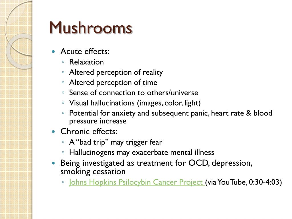 Mushrooms • Acute effects: • Relaxation • Altered perception of reality • Altered perception of time • Sense of connection to others/universe • Visual hallucinations (images, color, light) • Potential for anxiety and subsequent panic, heart rate & blood pressure increase • Chronic effects: • A “bad trip” may trigger fear • Hallucinogens may exacerbate mental illness • Being investigated as treatment for OCD, depression, smoking cessation • Johns Hopkins Psilocybin Cancer Project (via YouTube, 0:30-4:03)