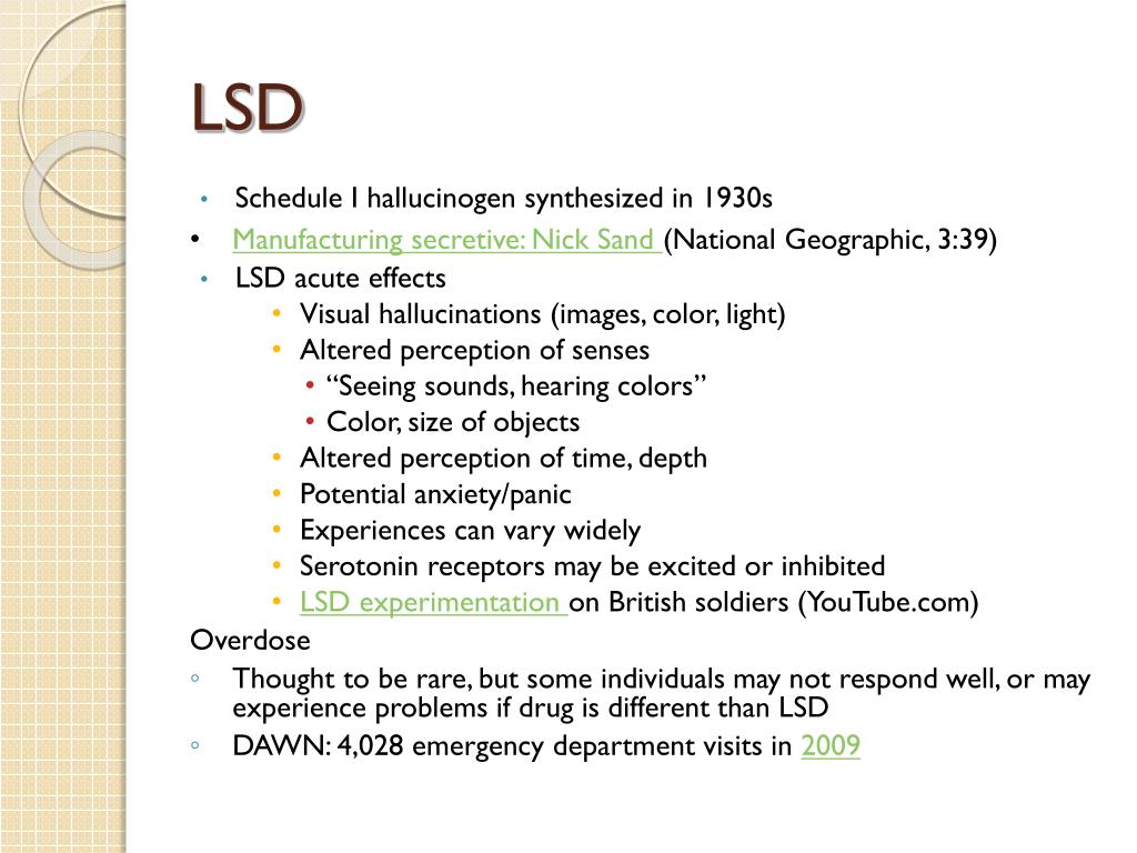 LSD • Schedule I hallucinogen synthesized in 1930s • Manufacturing secretive: Nick Sand (National Geographic, 3:39) • LSD acute effects • Visual hallucinations (images, color, light) • Altered perception of senses • “Seeing sounds, hearing colors” • Color, size of objects • Altered perception of time, depth • Potential anxiety/panic • Experiences can vary widely • Serotonin receptors may be excited or inhibited • LSD experimentation on British soldiers (YouTube.com) Overdose • Thought to be rare, but some individuals may not respond well, or may experience problems if drug is different than LSD • DAWN: 4,028 emergency department visits in 2009