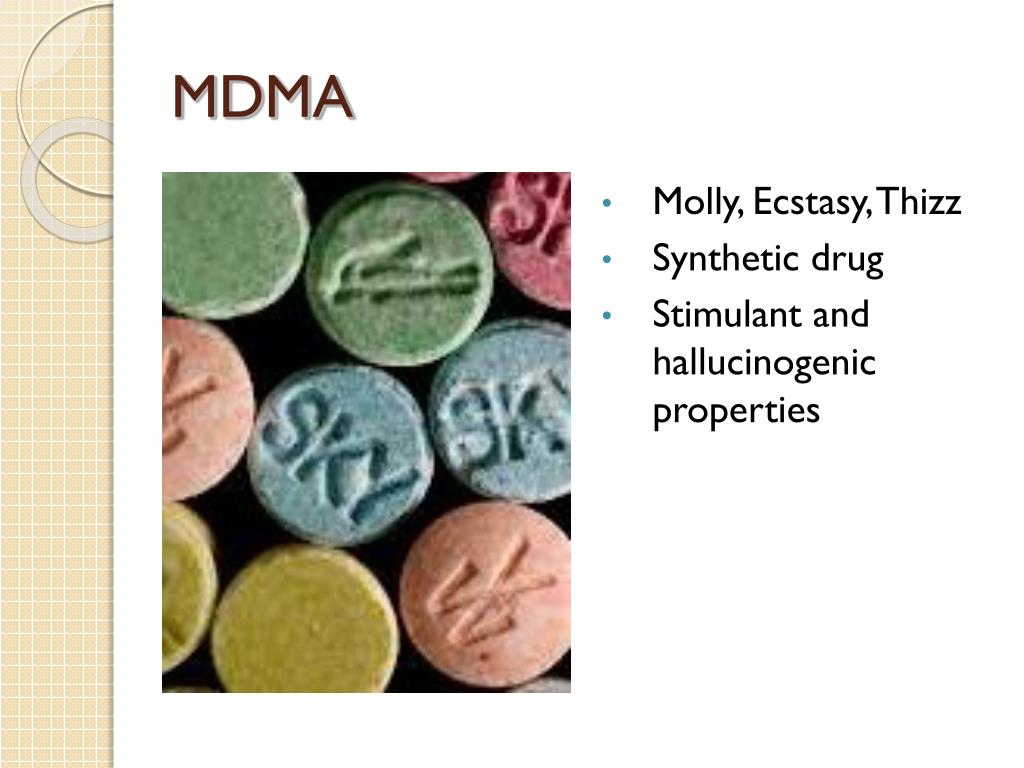 MDMA • Molly, Ecstasy, Thizz • Synthetic drug • Stimulant and hallucinogenic properties