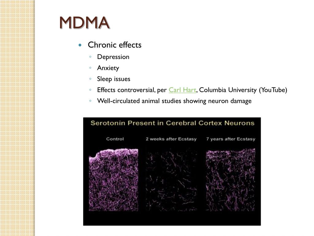 MDMA • Chronic effects • Depression • Anxiety • Sleep issues • Effects controversial, per Carl Hart, Columbia University (YouTube) • Well-circulated animal studies showing neuron damage