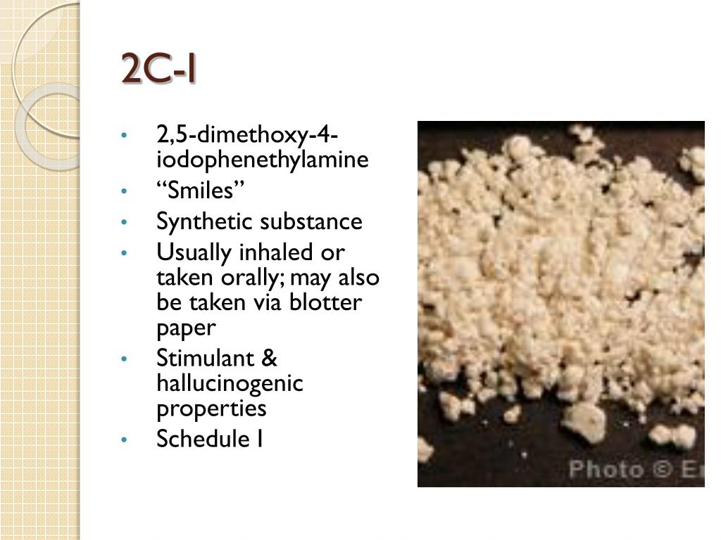 2C-I • 2,5-dimethoxy-4-iodophenethylamine • “Smiles” • Synthetic substance • Usually inhaled or taken orally; may also be taken via blotter paper • Stimulant & hallucinogenic properties • Schedule I