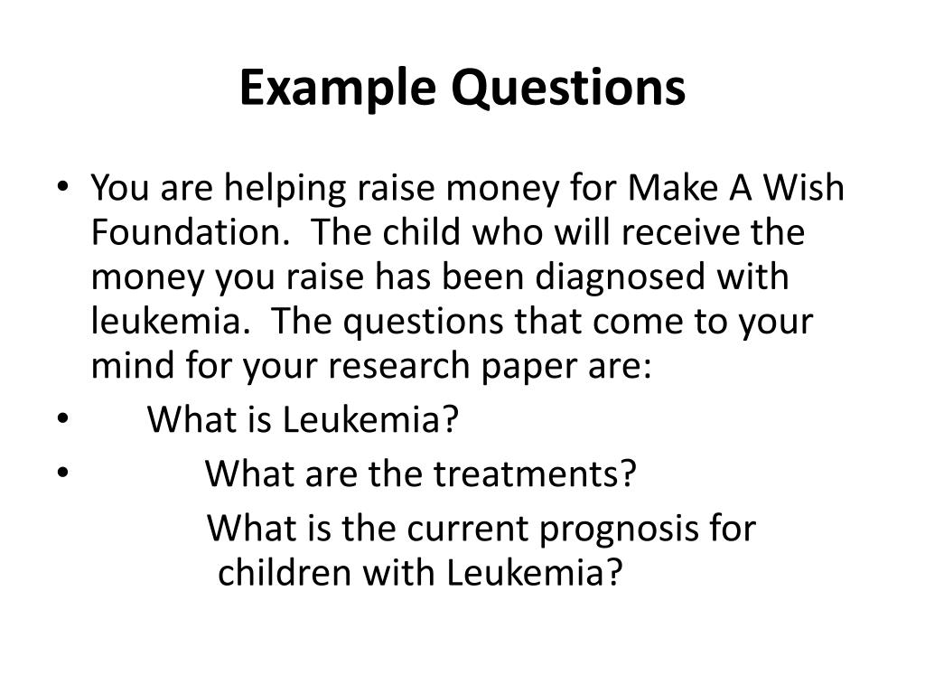 Example Questions • You are helping raise money for Make A Wish Foundation. The child who will receive the money you raise has been diagnosed with leukemia. The questions that come to your mind for your research paper are: • What is Leukemia? • What are the treatments? What is the current prognosis for children with Leukemia?