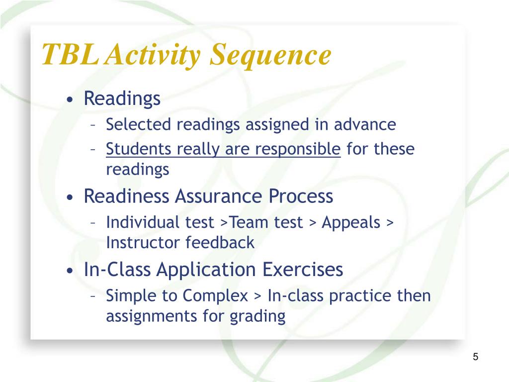 TBL Activity Sequence • Readings • Selected readings assigned in advance • Students really are responsible for these readings • Readiness Assurance Process • Individual test >Team test > Appeals > Instructor feedback • In-Class Application Exercises • Simple to Complex > In-class practice then assignments for grading