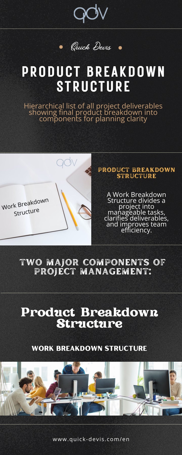 Quick Devis PRODUCT BREAKDOWN STRUCTURE Hierarchical list of all project deliverables showing final product breakdown into components for planning clarity PRODUCT BREAKDOWN STRUCTURE A Work Breakdown Structure divides a project into manageable tasks, clarifies deliverables, and improves team efficiency. TWO MAJOR COMPONENTS OF PROJECT MANAGEMENT: Product Breakdown Structure Work Breakdown Structure www.quick-devis.com/en