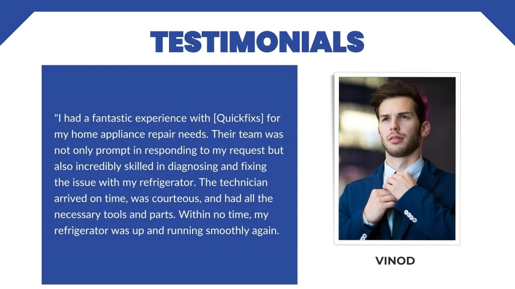 TESTIMONIALS "I had a fantastic experience with [Quickfixs] for my home appliance repair needs. Their team was not only prompt in responding to my request but also incredibly skilled in diagnosing and fixing the issue with my refrigerator. The technician arrived on time, was courteous, and had all the necessary tools and parts. Within no time, my refrigerator was up and running smoothly again. VINOD