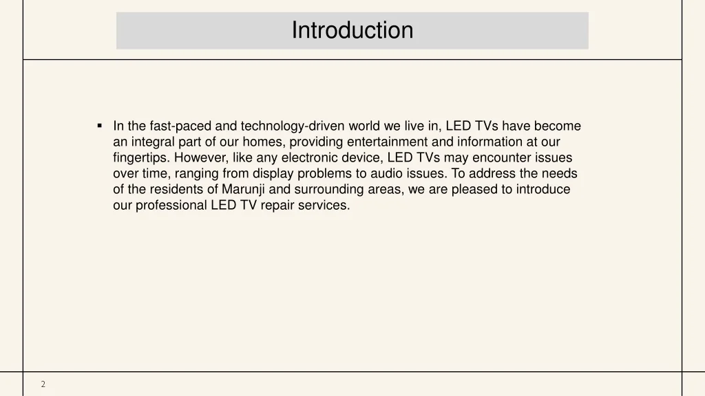 Introduction • In the fast-paced and technology-driven world we live in, LED TVs have become an integral part of our homes, providing entertainment and information at our fingertips. However, like any electronic device, LED TVs may encounter issues over time, ranging from display problems to audio issues. To address the needs of the residents of Marunji and surrounding areas, we are pleased to introduce our professional LED TV repair services.