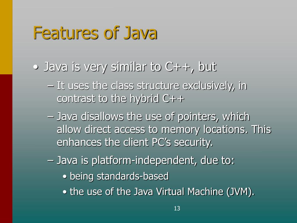 Features of Java • Java is very similar to C++, but • It uses the class structure exclusively, in contrast to the hybrid C++ • Java disallows the use of pointers, which allow direct access to memory locations. This enhances the client PC’s security. • Java is platform-independent, due to: • being standards-based • the use of the Java Virtual Machine (JVM).