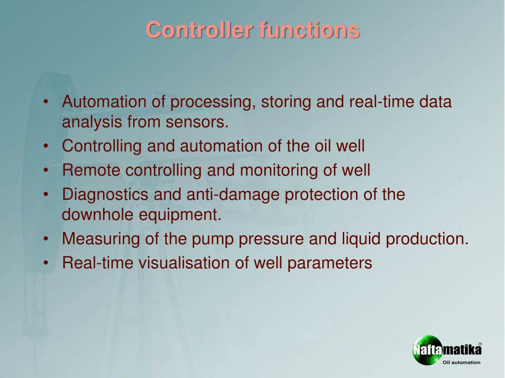 Controller functions • Automation of processing, storing and real-time data analysis from sensors. • Controlling and automation of the oil well • Remote controlling and monitoring of well • Diagnostics and anti-damage protection of the downhole equipment. • Measuring of the pumppressure and liquid production. • Real-time visualisation of well parameters