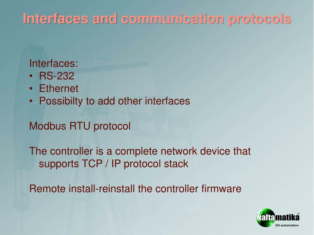 Interfaces and communication protocols • Interfaces: • RS-232 • Ethernet • Possibilty to add other interfaces • Modbus RTUprotocol • The controller is a complete network device that supports TCP / IP protocol stack • Remote install-reinstall the controller firmware