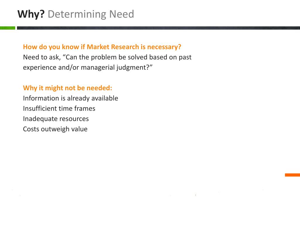 Why? Determining Need How do you know if Market Research is necessary? Need to ask, “Can the problem be solved based on past experience and/or managerial judgment?” Why it might not be needed: Information is already available Insufficient time frames Inadequate resources Costs outweigh value