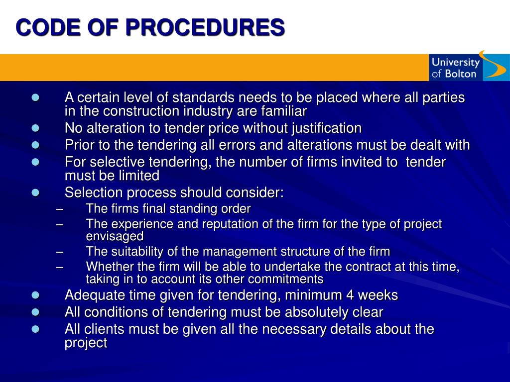 CODE OF PROCEDURES • A certain level of standards needs to be placed where all parties in the construction industry are familiar • No alteration to tender price without justification • Prior to the tendering all errors and alterations must be dealt with • For selective tendering, the number of firms invited to tender must be limited • Selection process should consider: • The firms final standing order • The experience and reputation of the firm for the type of project envisaged • The suitability of the management structure of the firm • Whether the firm will be able to undertake the contract at this time, taking in to account its other commitments • Adequate time given for tendering, minimum 4 weeks • All conditions of tendering must be absolutely clear • All clients must be given all the necessary details about the project